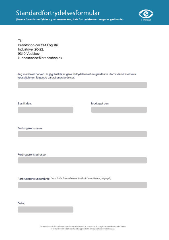 Du skal inden 30 dage fra modtagelse give os meddelelse om, at du ønsker at fortryde dit køb. Meddelelsen skal gives via e-mail på adressen kundeservice@brandshop.dk. I din meddelelse skal du gøre os tydeligt opmærksom på, at du ønsker at benytte din fortrydelsesret. Alternativt, kan du benytte dig af vores standardfortrydelsesformular, som du finder nederst i handelsbetingelserne.